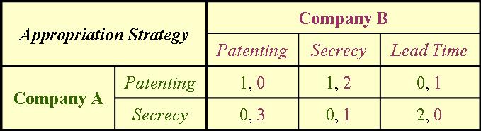 - If Company A applies for a patent, while Company B uses lead time, the payoff are 0 for Company A and 1 for Company B, since Company B will exploit the market sooner than Company A.